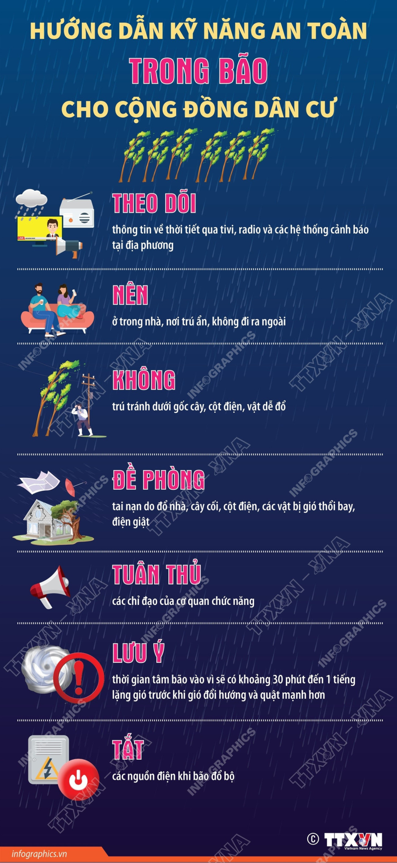 Trong bão, người dân cần theo thông tin về thời tiết qua tivi, radio và các hệ thống cảnh báo tại địa phương; nên ở trong nhà, nơi trú ẩn, không đi ra ngoài; không trú tránh dưới gốc cây, cột điện, vật dễ đổ.