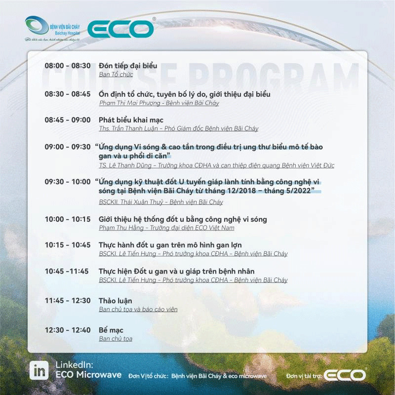 Hội thảo được tổ chức với các chuyên đề: Ứng dụng vi sóng và Cao tầng trong điều trị ung thư biểu mô tế bào gan và u phổi di căn; Giới thiệu đốt u bằng công nghệ vi sóng; thực hành đốt u gan và u giáp trên bệnh nhân.