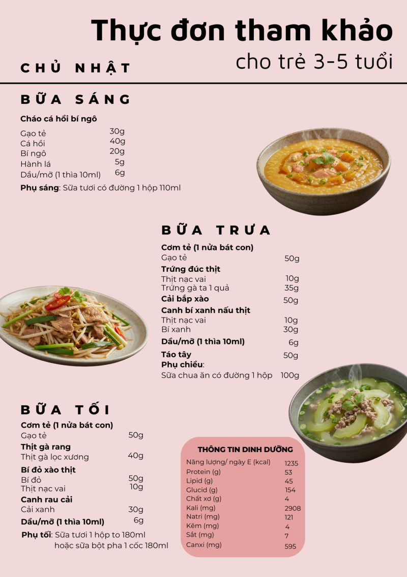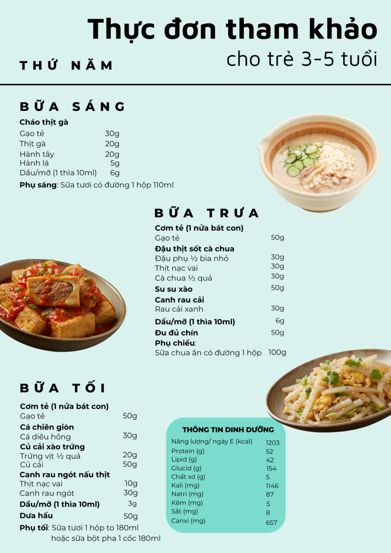 Giai đoạn 3–5 tuổi là thời kỳ trẻ phát triển nhanh cả về thể chất lẫn trí tuệ, nhu cầu năng lượng và dinh dưỡng tăng cao. Một thực đơn hợp lý, cân đối giữa các nhóm thực phẩm sẽ giúp trẻ ăn ngon, tăng trưởng tốt và phòng tránh thiếu vi chất. Bài viết giới thiệu thực đơn mẫu cho trẻ 3–5 tuổi được xây dựng dựa trên khuyến nghị của Viện Dinh dưỡng, đảm bảo đủ năng lượng, cân đối giữa các nhóm thực phẩm và phù hợp với khẩu phần khuyến nghị hằng ngày cho lứa tuổi mầm non.
