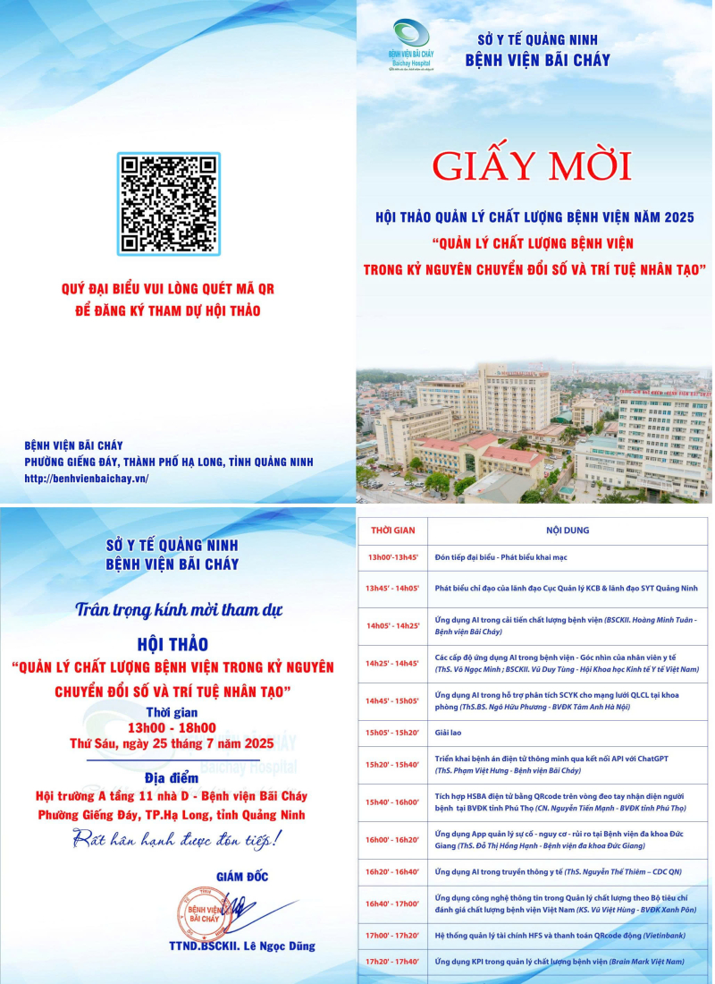 Bệnh viện Bãi Cháy trân trọng kính mời quý đại biểu, các chuyên gia, cán bộ y tế, đối tác công nghệ và các đơn vị quan tâm đến tham dự chương trình.