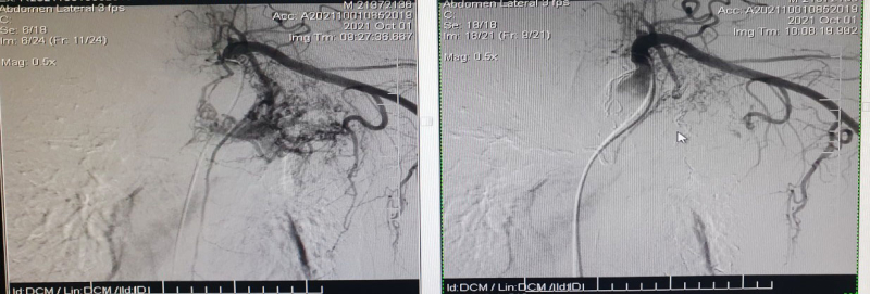 Hình ảnh nút động mạch phế quản trước (bên trái) và sau can thiệp (bên phải) trên màn hình DSA