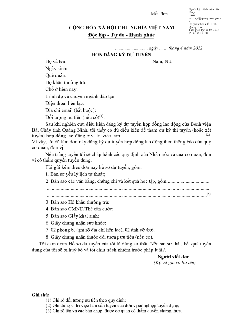 Mẫu đơn dự tuyển:mẫu đơn đăng ký dự tuyển 2022 - BVBC