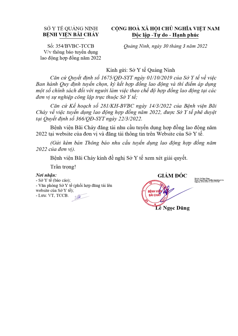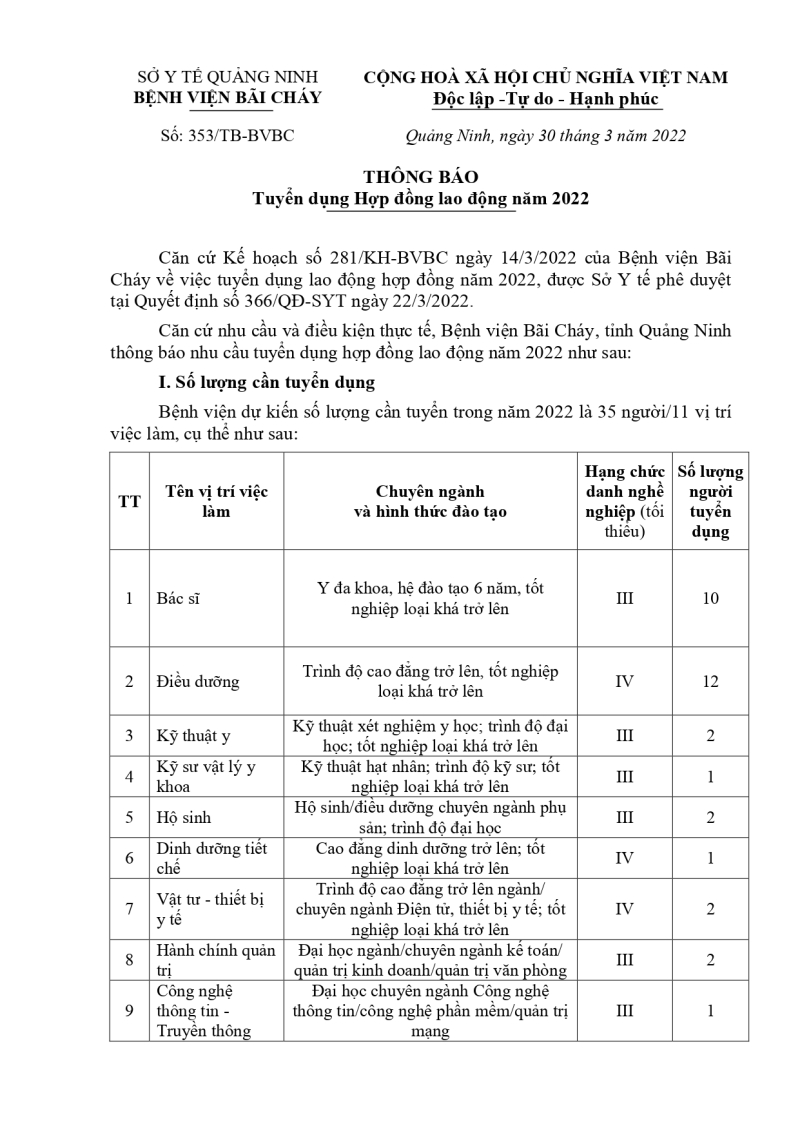 Bệnh viện Bãi Cháy ban hành công văn số 353/TB-BVBC ngày 30/3/2022 về Tuyển dụng hợp đồng lao động năm 2022.