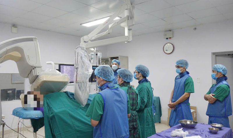 Kíp Can thiệp đang tiến hành chụp và đặt stent cho người bệnh.