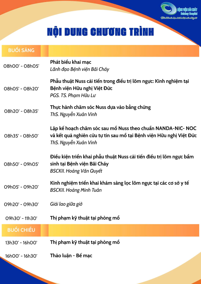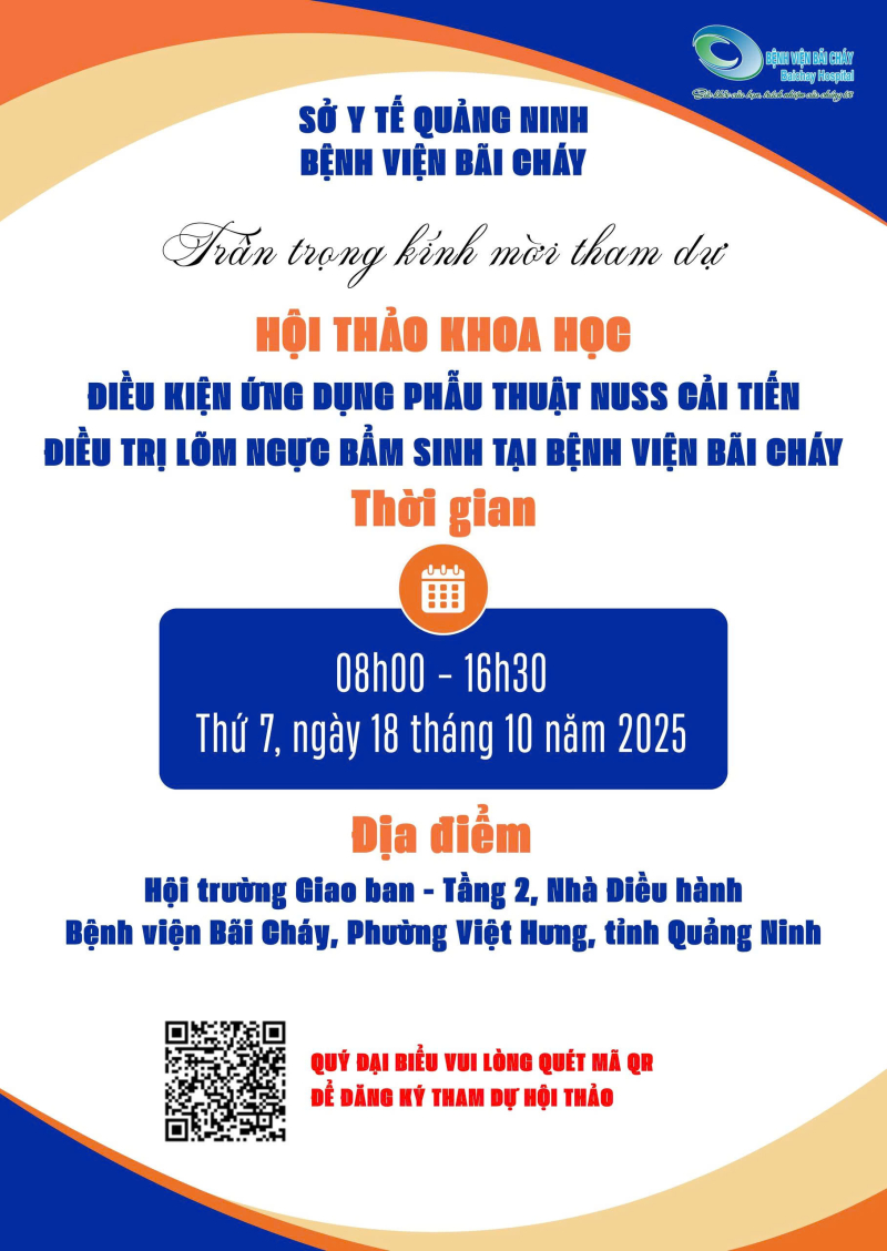 Hội thảo khoa học “Điều kiện ứng dụng phẫu thuật Nuss cải tiến điều trị lõm ngực bẩm sinh tại Bệnh viện Bãi Cháy” hứa hẹn sẽ mang đến nhiều giá trị chuyên môn thực tiễn, góp phần nâng cao chất lượng điều trị, chăm sóc người bệnh. Bệnh viện Bãi Cháy trân trọng kính mời quý đại biểu, các chuyên gia, cán bộ y tế, đối tác công nghệ và các đơn vị quan tâm đến tham dự chương trình. Thông tin chi tiết, nội dung các bài tham luận và hình ảnh hội thảo sẽ được đăng tải trên website và các kênh truyền thông chính thức của bệnh viện./
