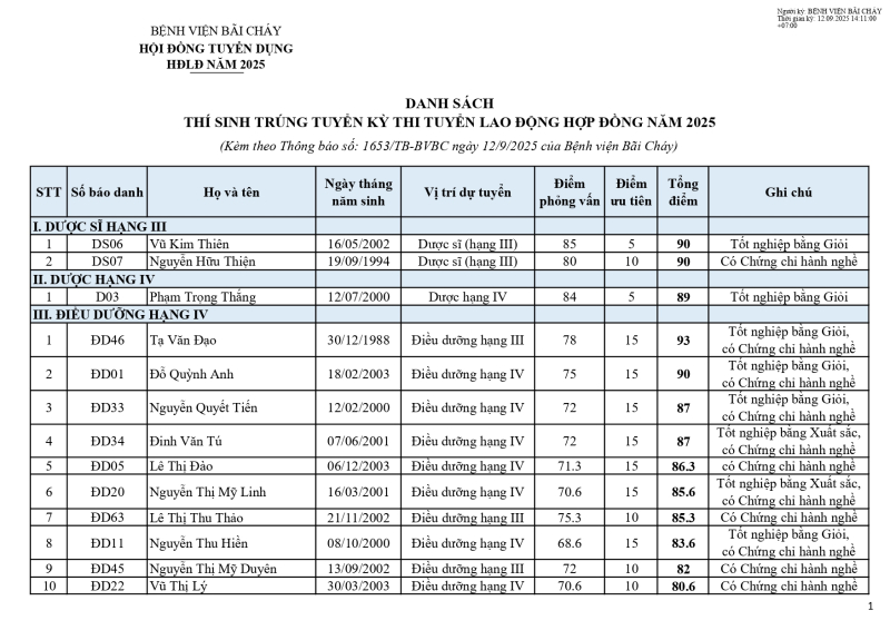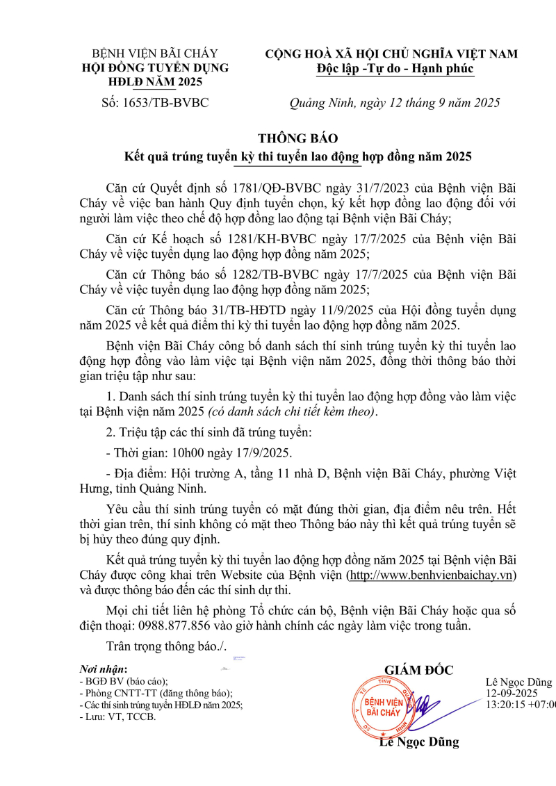 Bệnh viện Bãi Cháy thông báo kết quả trúng tuyển kỳ thi tuyển dụng lao động hợp đồng năm 2025