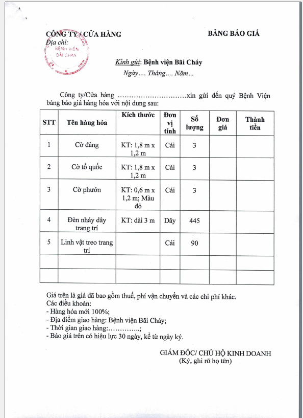 Thông báo số 2155 về việc mua đồ trang trí phục vụ các ngày lễ, tết của Bệnh viện Bãi Cháy 2024/12/05 08:25
