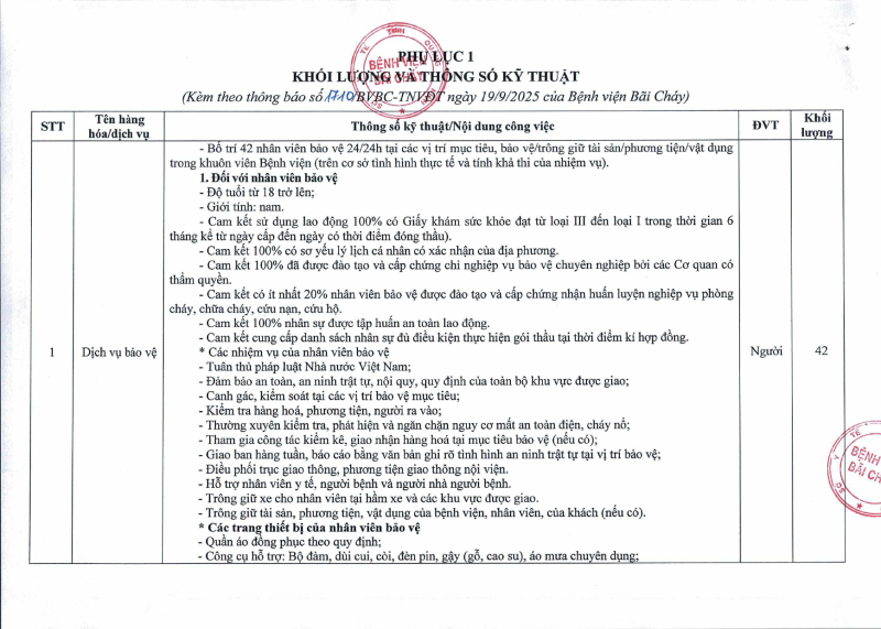 Thông báo 1710 nhu cầu cung cấp dịch vụ bảo vệ năm 2026 tại Bệnh viện Bãi Cháy 2025/09/22 08:13 Thông báo 1710 nhu cầu cung cấp dịch vụ bảo vệ năm 2026 tại Bệnh viện Bãi Cháy