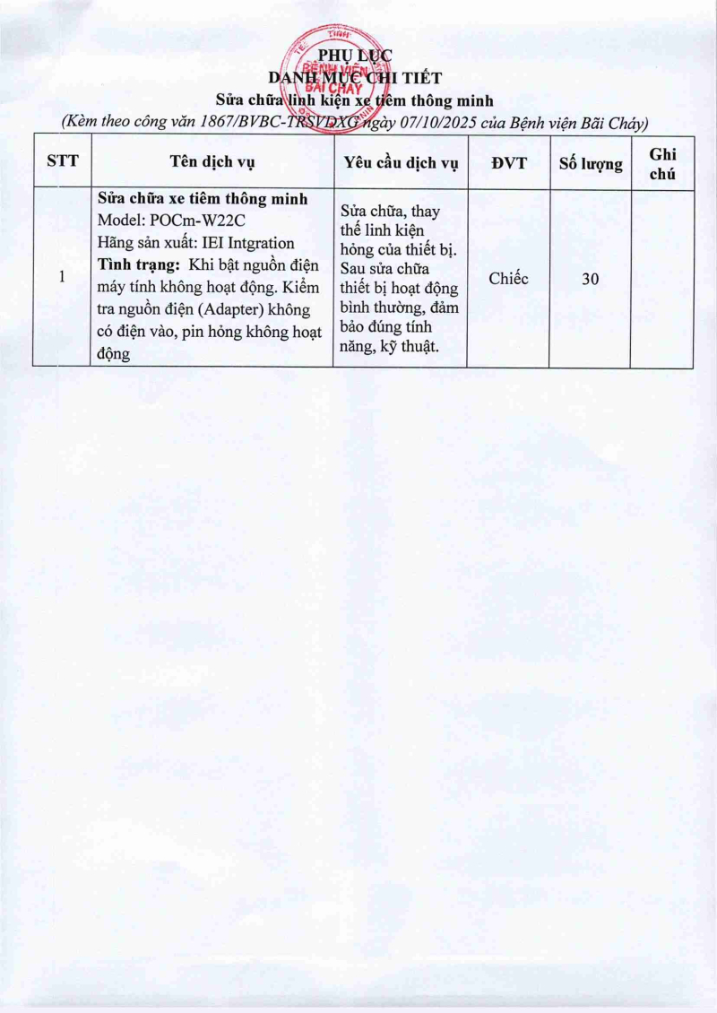 Thông báo 1867 về nhu cầu sửa chữa linh kiện xe tiêm thông minh