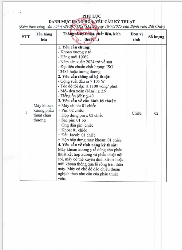 Thông báo số 1294 về nhu cầu mua máy khoan xương phẫu thuật chấn thương cho khoa chấn thương chỉnh hình 2025/07/18 08:52