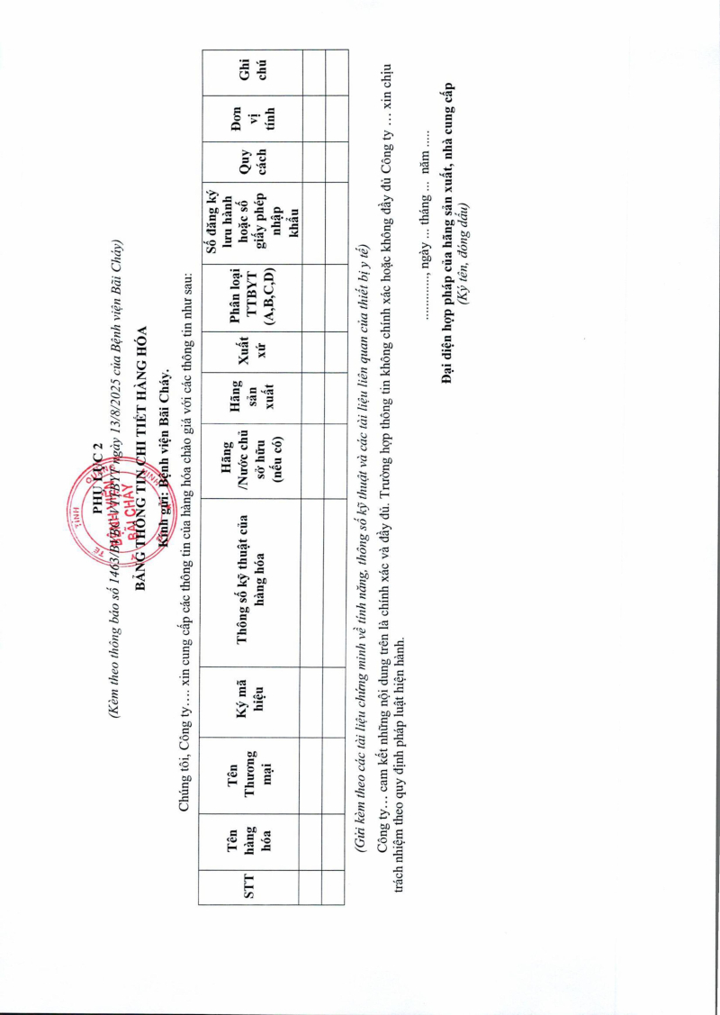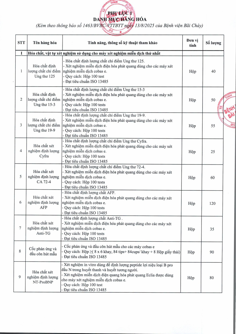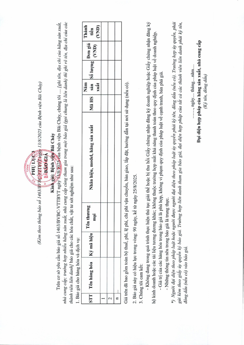 Thông báo số 1463 về nhu cầu mua sắm hóa chất , vật tư xét nghiệm phục vụ công tác chuyên môn năm 2025,2026 đợt 3 2025/08/14 03:54