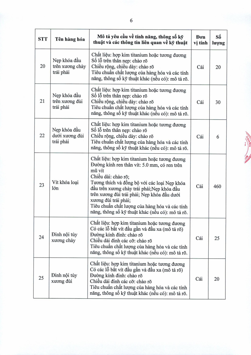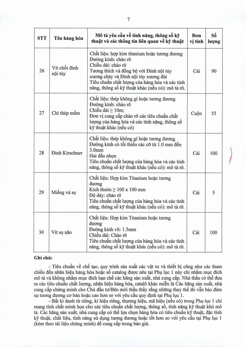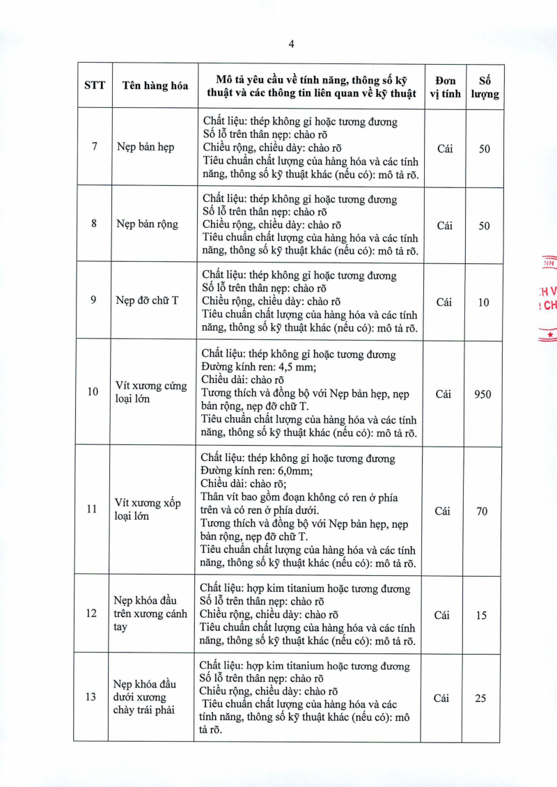 Thông báo số 2233 về nhu cầu mua sắm đinh nẹp vít chấn thương phục vụ công tác chuyên môn năm 2026
