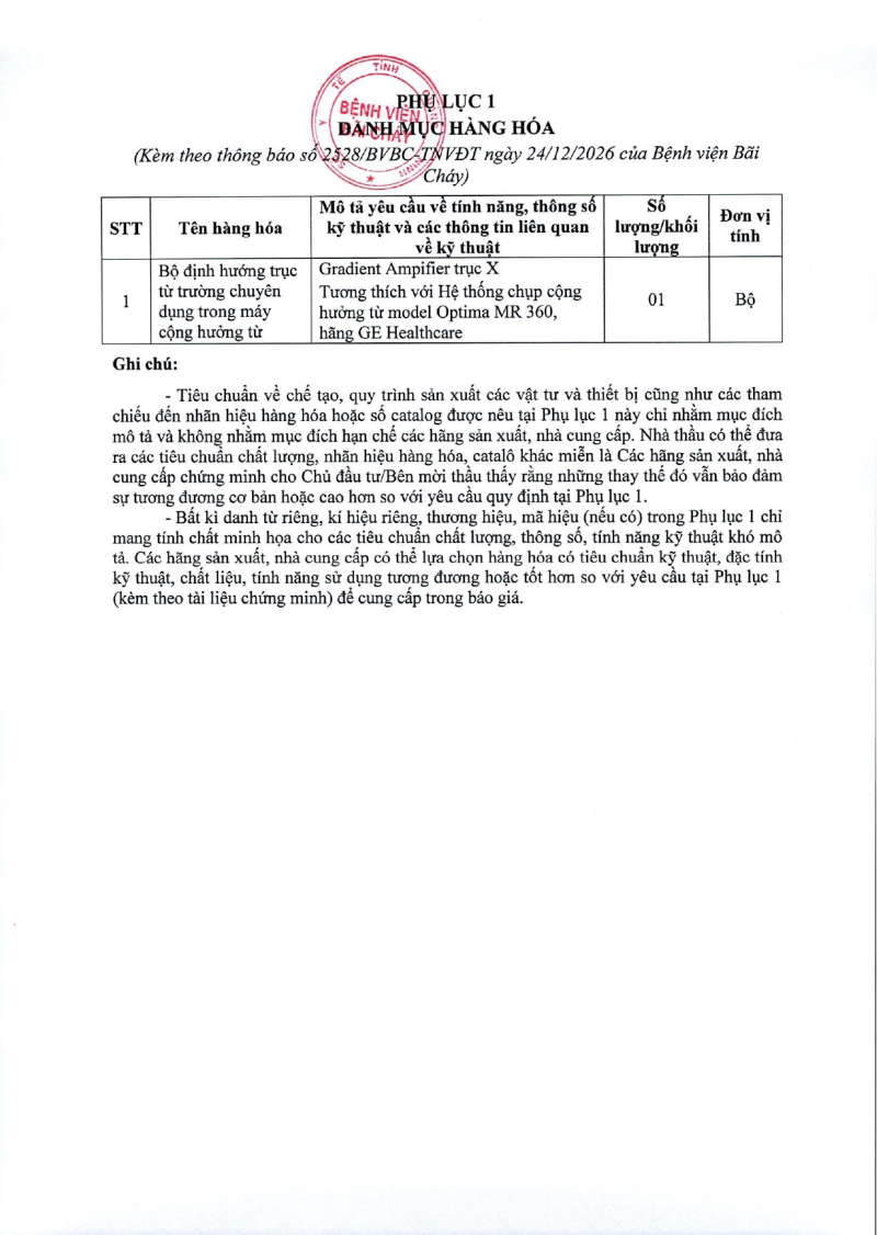 Thông báo số 2528 về nhu cầu mua sắm bộ định hướng trục từ trường chuyên dụng cho máy chụp cộng hưởng từ GE Optima MR 360 2025/12/24 06:33