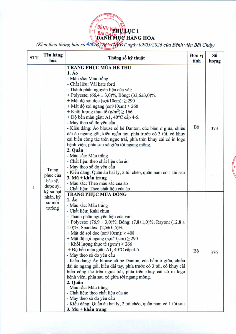 Thông báo số 408 về nhu cầu mua sắm trang phục bảo hộ nhân viên y tế năm 2026
