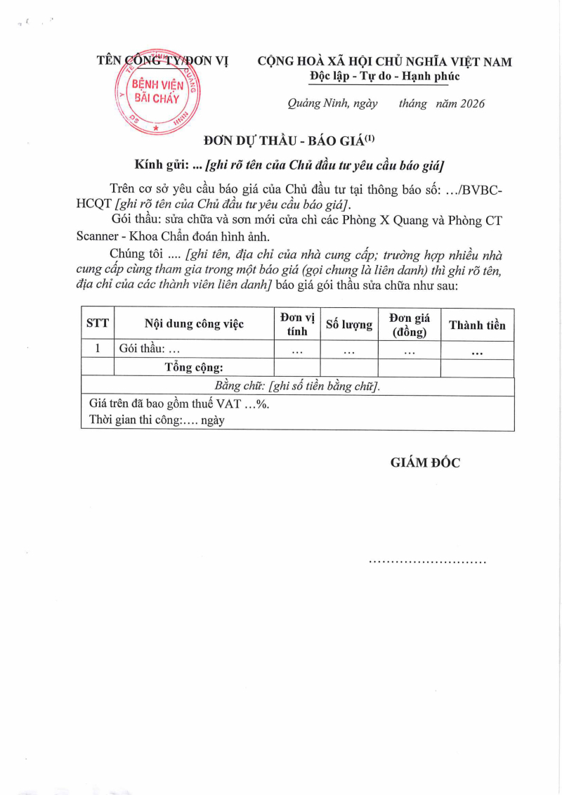 Thông báo số 410 về nhu cầu sửa chữa và sơn mới cửa chì các phòng X Quang và phòng CT Scanner khoa Chẩn đoán hình ảnh 2026/03/09 07:21