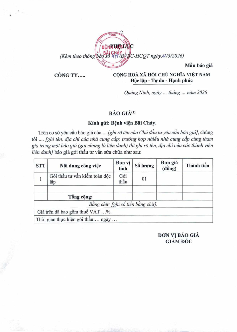 Thông báo số 478 về nhu cầu thuê tư vấn kiểm toán dự án sửa chữa, khắc phục các tồn tại theo kiến nghị Cảnh sát PCCC&CNCH 2026/03/17 09:20