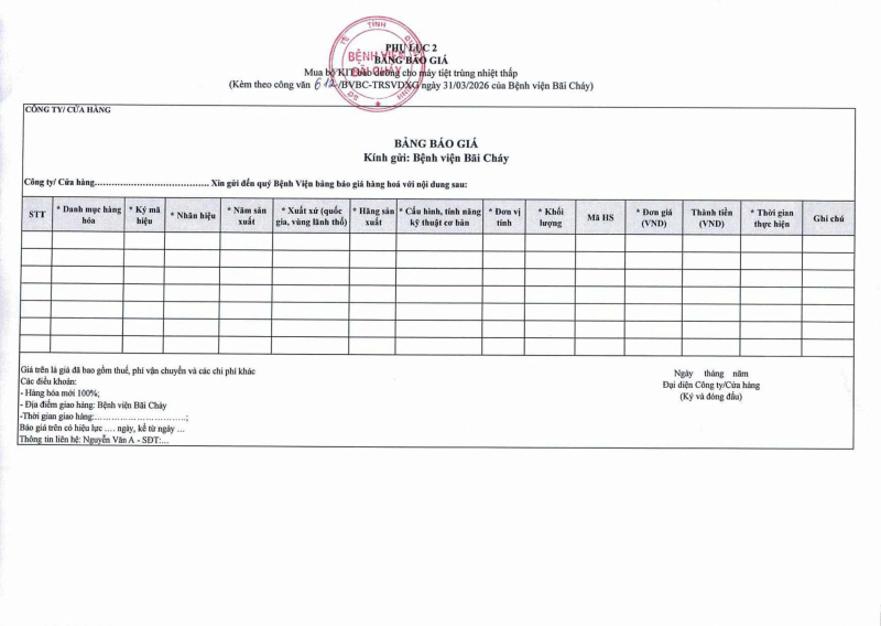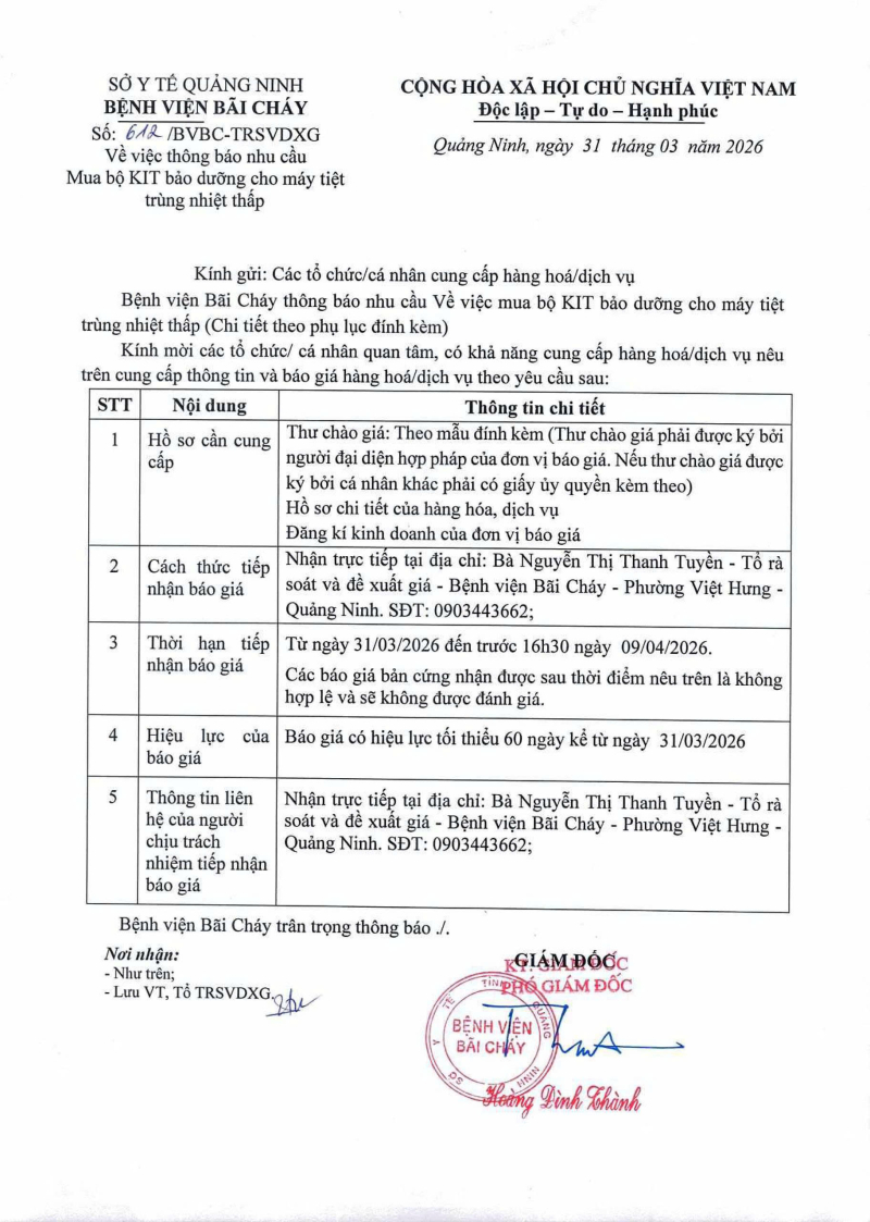 Thông báo số 612 về nhu cầu mua bộ KIT bảo dưỡng cho máy tiệt trùng nhiệt thấp