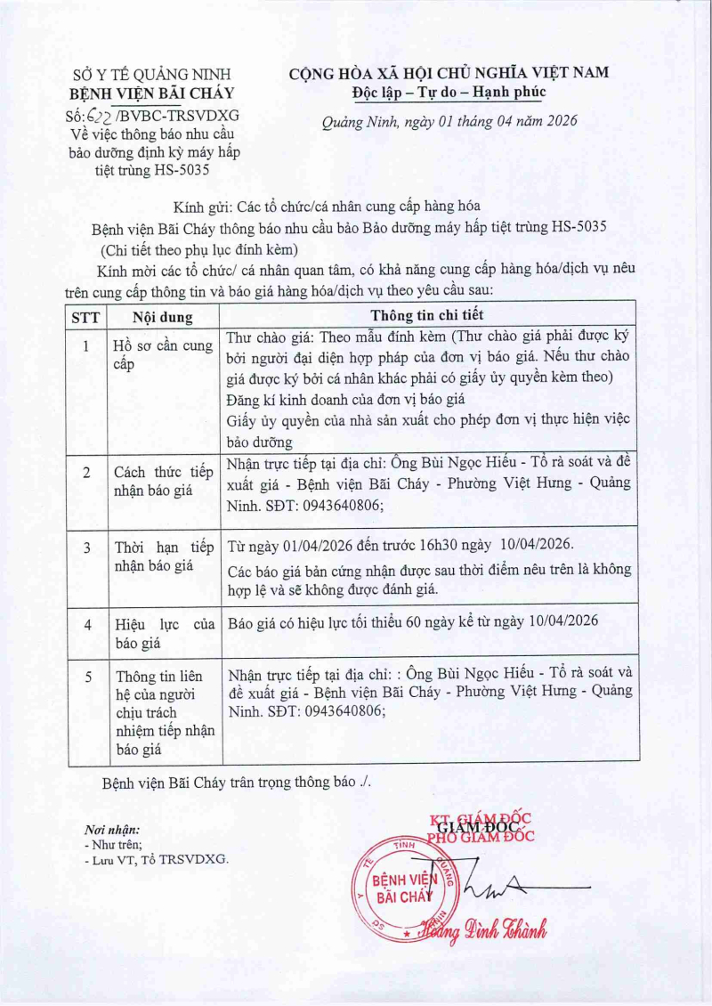 Thông báo số 622 về nhu cầu bảo dưỡng định kỳ máy hấp tiệt trùng HS–5035