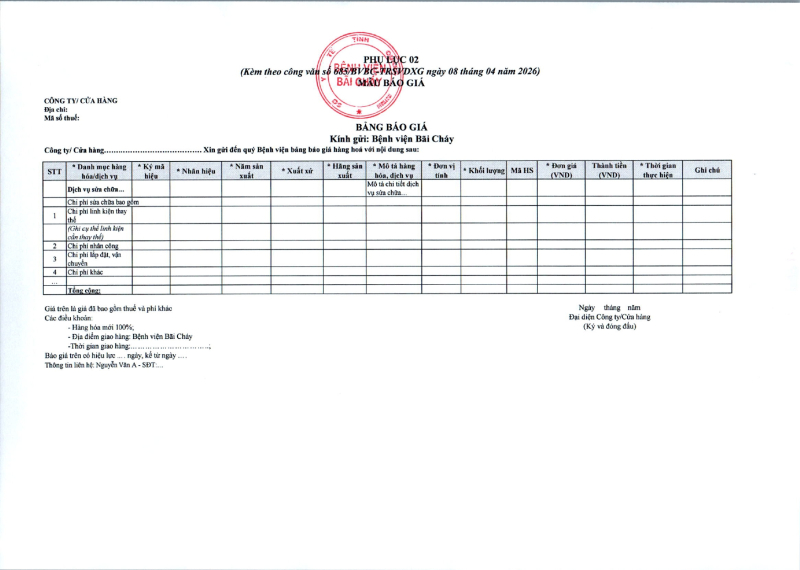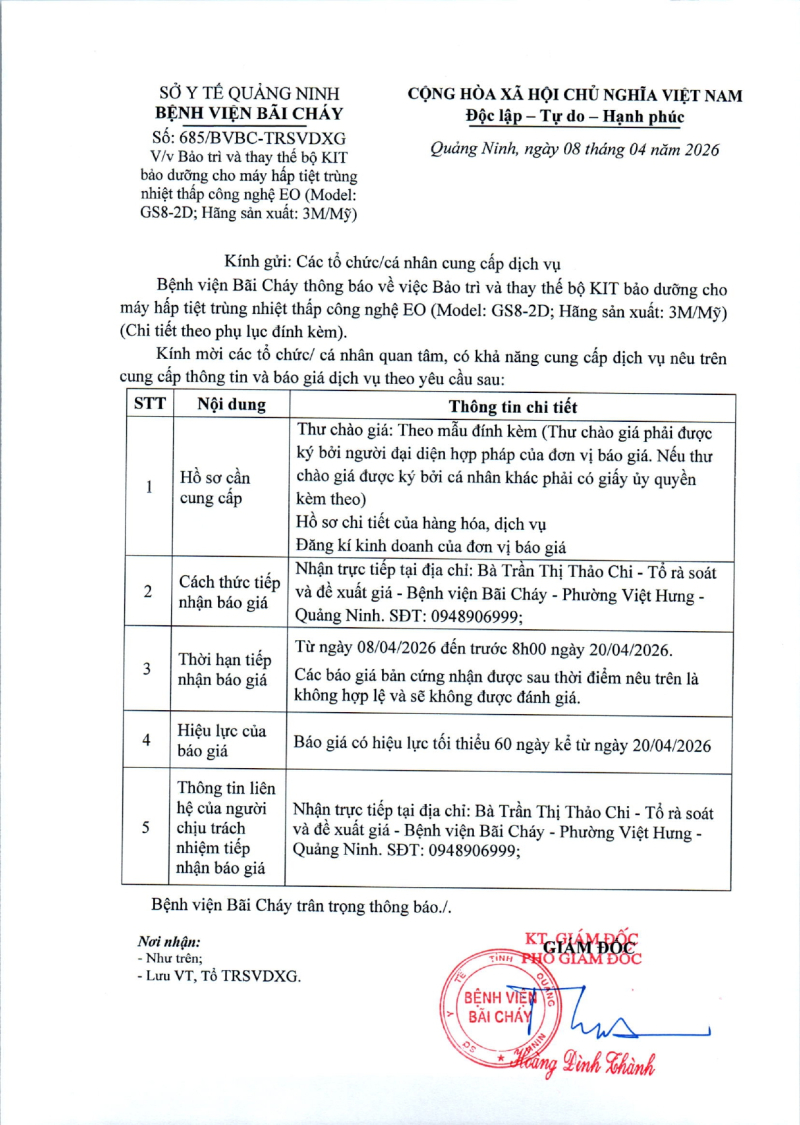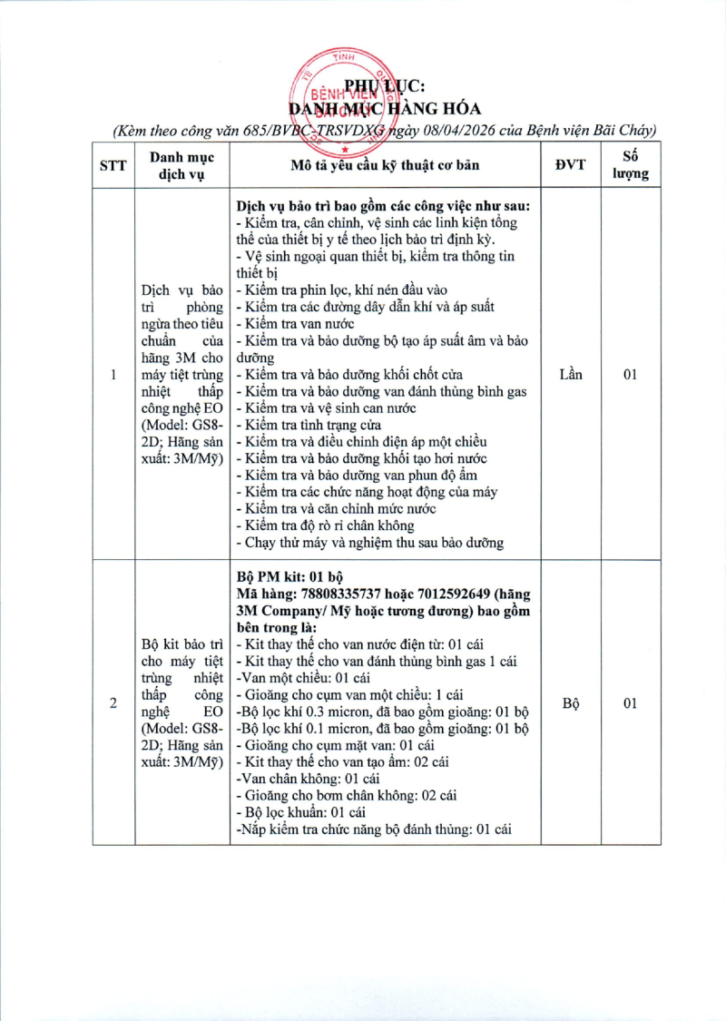 Thông báo số 685 về nhu cầu bảo trì và thay thế bộ KIT bảo dưỡng cho máy hấp tiệt trùng nhiệt thấp công nghệ EO Model: GS8-2D; Hãng sản xuất: 3M/Mỹ
