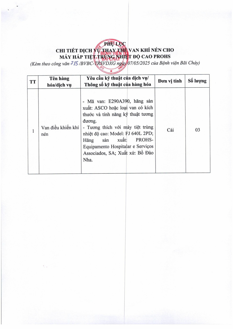 Thông báo số 785 về nhu cầu thay thế van khí nén cho máy tiệt trùng nhiệt độ cao Prosh 2025/05/07 08:27