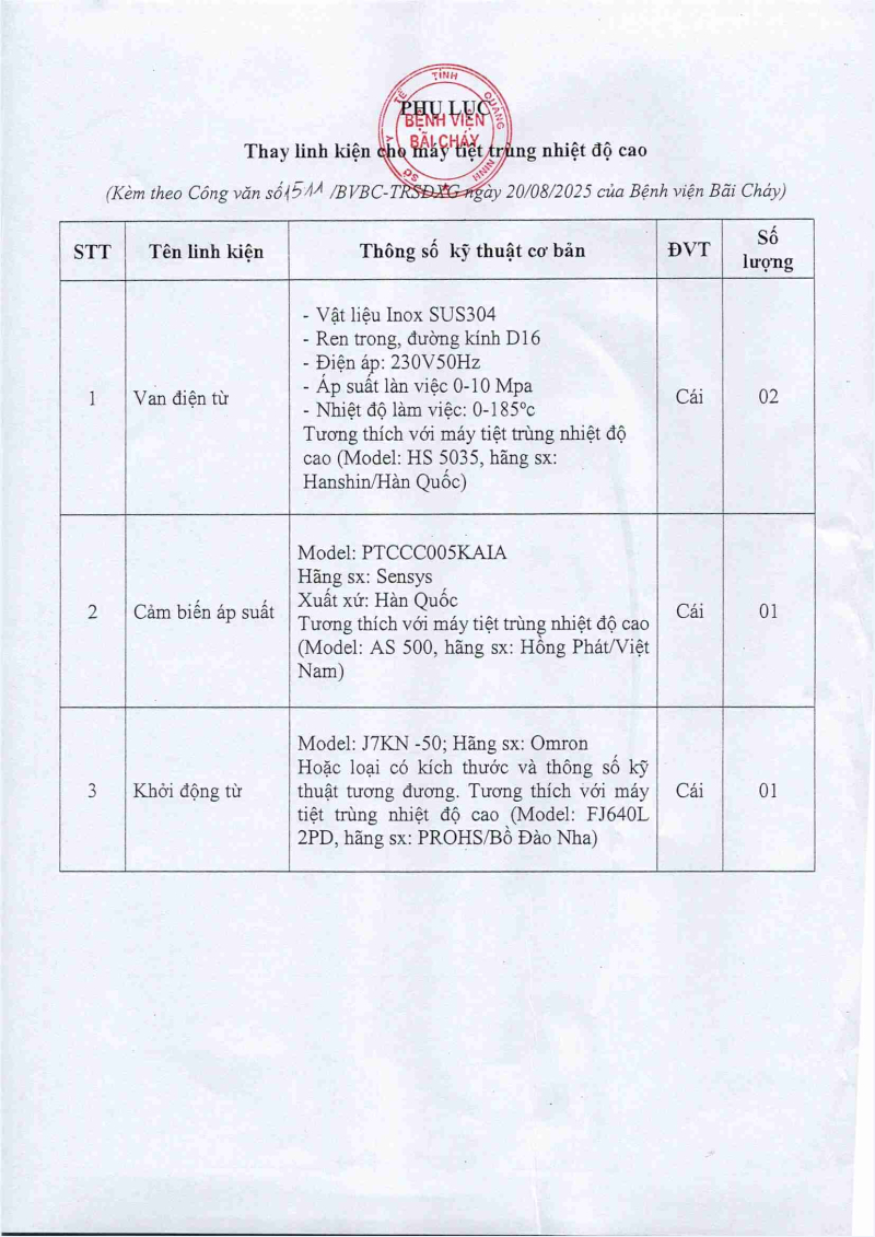 Thông báo số 622 về nhu cầu bảo dưỡng định kỳ máy hấp tiệt trùng HS–5035
